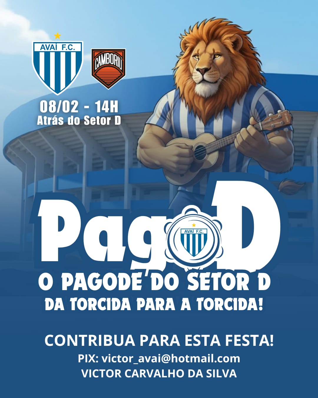 O “evento” é aberto ao público e gratuito, onde iremos dispor de uma roda de pagode em frente ao estacionamento dos camarotes do D, mediante fechamento parcial da rua Celso Martins da Silveira.