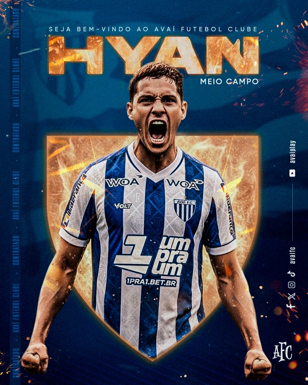 Saudações azurras. Nesta tarde, o Avaí anunciou a contratação do volante/meia Hyan para a sequência da temporada. O jogador de 21 anos vem por empréstimo junto ao Santos até novembro deste ano. Trata-se de um segundo volante, que busca construir o jogo desde trás, mas chega bem na área visando a finalização. O seu estilo é parecido com João Vitor, que estava por aqui no ano passado.