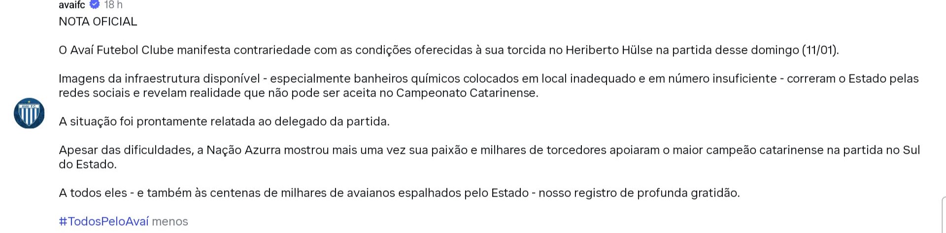 Saudações azurras. O tratamento dado à torcida avaiano no jogo contra o Criciúma foi alvo de críticas por parte do Avaí. O clube se manifestou por meio de uma Nota Oficial reclamando das condições precárias do Estádio Heriberto Hulse para receber a torcida adversária. Novidade para mim? Nenhuma, pelo fato de que em alguns Estádios de Santa Catarina não tem nenhuma condição para receber torcedores visitantes seja por falta de banheiros adequados para todos os públicos e em alguns, até falta água para tomar. Já vi muito pelas andanças nos últimos anos e não me surpreende! Enquanto a Federação Catarinense de Futebol não intervir, será essa zona infelizmente!