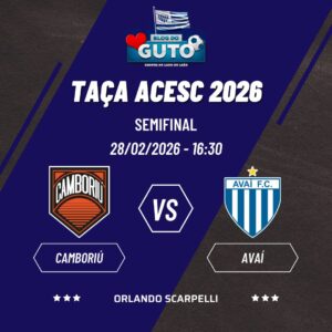 Saudações azurras. Neste sábado, o Avaí e o Camboriú voltam a se enfrentar pela semifinal da Taça Acesc. É jogo único, por esta razão acredito que será uma partida definida no detalhe. Creio que o Avaí precisa ter seus cuidados, mas tem que se impor buscando a vitória dentro do tempo normal. Para este compromisso, o técnico Cauan terá a volta do lateral-esquerdo DG, que cumpriu suspensão automática na vitória sobre o Santa Catarina. Sendo assim, uma provável equipe titular deve ser Léo Aragão, Gabriel Simples, Allyson, Baldini e DG; Zé Ricardo, Luiz Henrique, Daniel Penha e Jean Lucas; Thayllon e Felipe Avenatti. Vai pra cima deles, Leãoooooooooooooooooooo!